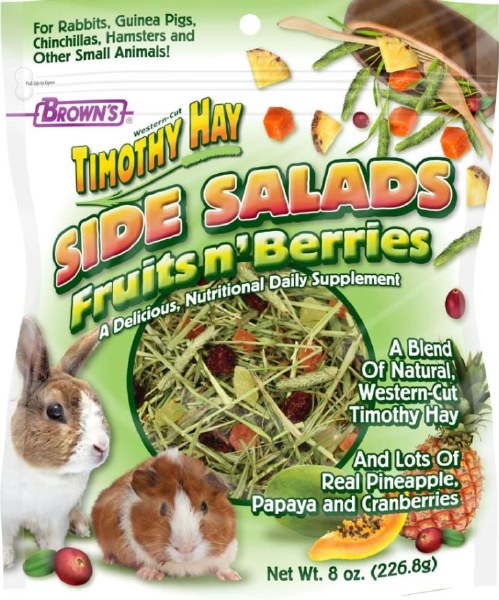 Give your furry friend a meal to satisfy her natural foraging instincts with Brown's Timothy Hay Side Salads Fruits n' Berries Rabbit Food. It features timothy hay with nutrient-rich real fruits and berries like papaya, pineapple and cranberries. This diet is rich in antioxidants and vitamins for rabbits, guinea pigs, chinchillas, hamsters and other small animals. It is also a highly digestible source of fiber and easier to feed than loose hay. With dried fruits and berries that are safer and more economical, consider Brown's Timothy Hay Side Salads Fruits n' Berries Rabbit Food as a reliable option to feed your little one.