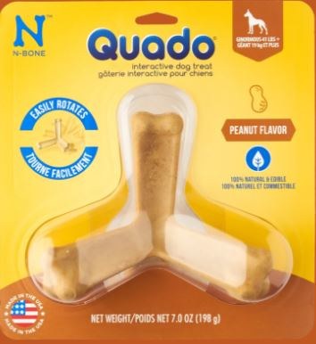 The unique “quad” design makes it easy for your canine pal to hold, chew, and play. Quado® is easy for dogs to move into whatever chewing position they want! Quado® also helps reduce plaque and tartar buildup as your dog chews, while the delicious Bacon flavor entices and peppermint helps freshen breath. It’s great for oral health! Quado® is not made with any plastic, nylon or rubber and is completely edible. Keep your dog entertained and help curb destructive chewing behaviors with this unique interactive treat!