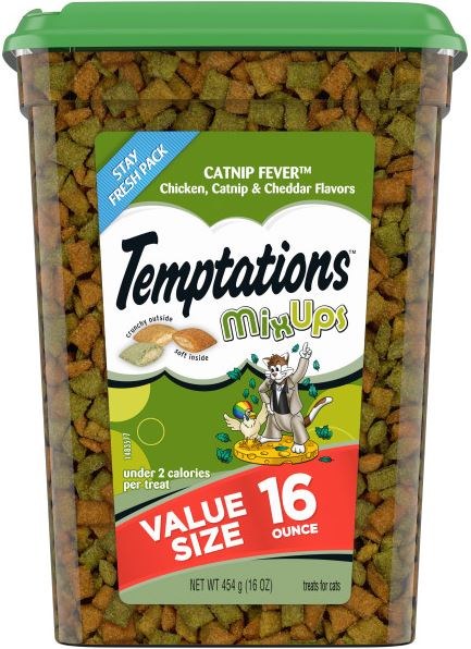 Reward your cat with scrumptious playtime cat snacks that are 100% nutritionally complete for adult cat maintenance and that help to control tartar. Featuring a tempting mix of flavors, such as chicken, catnip and cheese, TEMPTATIONS MixUps variety cat treats are a great-tasting playtime reward. They're the perfect size treats for cat toys, so try placing a few inside a treat dispenser toy and watch your cat chase and swat away. Plus, at only 2 low calories per treat, your feline friend can enjoy the crunchy outside and soft center anytime. America's #1 cat treat* is the perfect way to show your feline friend how much you care.
