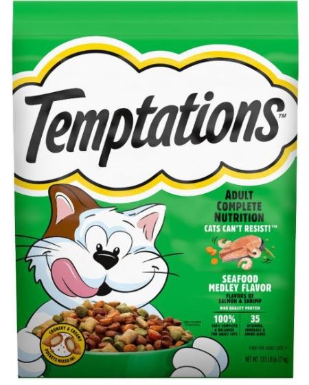 Nothing gets cats more excited than TEMPTATIONS treats, and now you can bring the magic of TEMPTATIONS treat time to the main feeding experience with delicious, irresistible TEMPTATIONS dry kibble! With TEMPTATIONS Seafood Medley Flavor adult dry cat food, your cat gets to enjoy the tasty and familiar flavors of TEMPTATIONS for every meal. This tempting dry food has tasty, crunchy bite-sized pockets with a crunchy exterior and soft filling mixed in with the kibble to keep your cat coming back for more. Beyond being an enticing meal, TEMPTATIONS dry cat food is 100% complete and balanced for adult cats and made with high-quality protein that helps support strong and healthy muscles. This savory cat food contains 35 essential vitamins, minerals, and amino acids. It also contains Calcium and Vitamin D to support healthy teeth and bones and Vitamin E to help support a strong immune system. Your feline friend will thank you! If you want your cat to get a nutritious meal that they’ll lose their cool over, look no further than TEMPTATIONS Seafood Medley Flavor adult dry cat food.