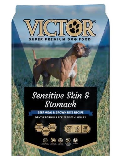 VICTOR's Sensitive Skin and Stomach Beef Meal & Brown Rice Recipe is ideal for dogs with sensitivities or allergies. This digestible formula is gentle on the stomach and formulated without common allergens like gluten, chicken, corn, or soy. With omega 3 and 6, plus Vitamin E, this recipe supports a healthy coat and skin.  Like all VICTOR products, the majority of the protein in this recipe comes from high-quality meat sources. Specifically, 77% of the protein comes from beef, pork and salmon meals, plus dried beef. The protein to fat ratio for this formula is: 24% protein and 14% fat. This recipe is appropriate for dogs of all life stages - puppy through adulthood.