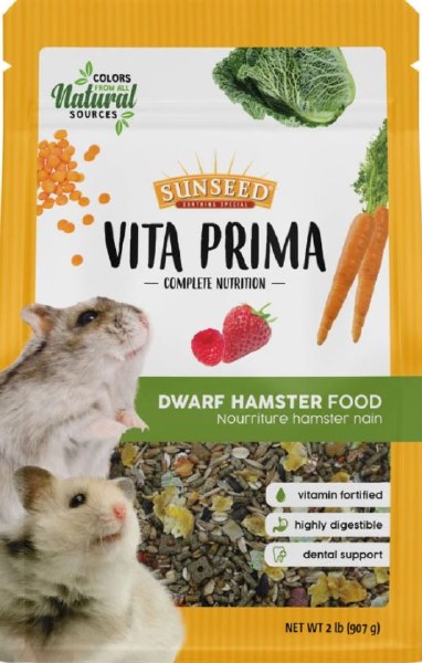 Your dwarf hamster deserves food that is both delicious and nutritious. Sunseed Vita Prima Vitamin-Fortified with Essential Nutrients Dwarf Hamster Dry Food is fortified with key vitamins, minerals, and nutrients that help your little guy stay healthy. Made with ancient grains, alfalfa pellets, and a yummy blend of fruits and vegetables—these crunchy, premium food pellets encourage your dainty dwarf to follow his natural foraging instincts and promote the chewing behavior he needs to wear down his ever-growing teeth.