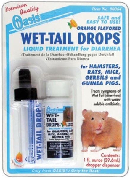 Oasis Wet-Tail Drops are a highly effective treatment for relief from Wet Tail (Diarrhea). These drops jay be mixed with drinking water or administered via direct oral dosing, and gets to work quickly offering small pets relief from Wet Tail.